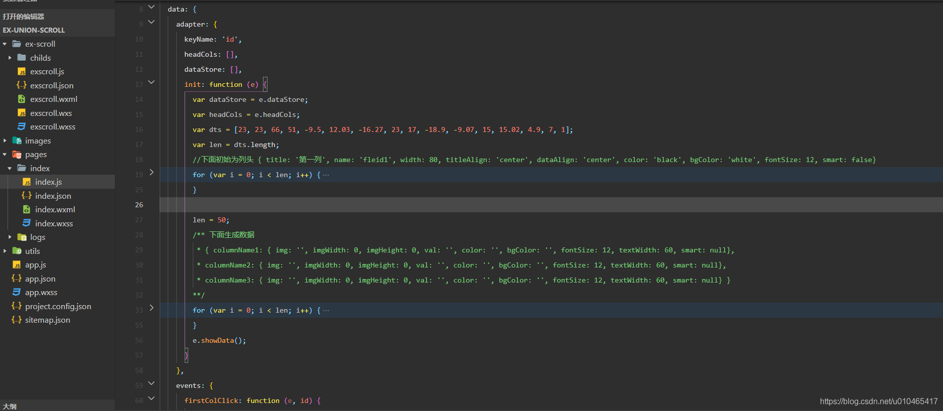 init:为初始化数据提供的方法。参数 e 为 adapter 对象,包含:keyName、headCols、dataStore、init、showData、thisObj,其中 showData 方法在数据初始化完成后显示数据,thisObj 等同于当前 Page 对象。