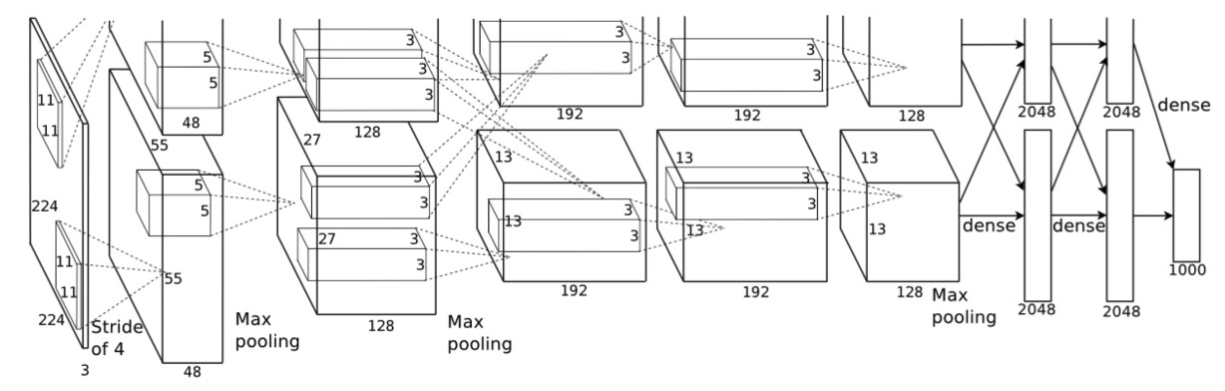 上图中的输入是224×224224×224,不过经过计算(224−11)/4=54.75(224−11)/4=54.75并不是论文中的55×5555×55,而使用227×227227×227作为输入,则(227−11)/4=55