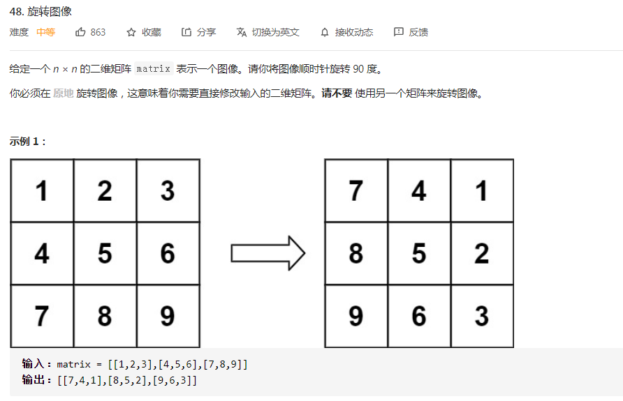 这道题要求顺时针翻转90°,即将矩阵先沿对角线翻转再垂直镜像翻转。