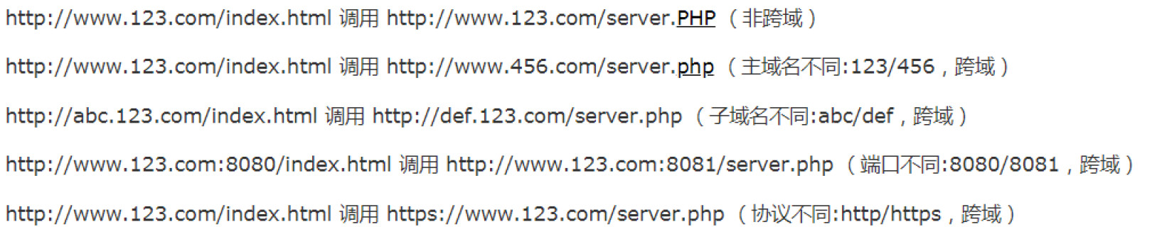 - 跨域是指通过JS在不同的域之间进行数据传输或通信,比如用ajax向一个不同的域请求数据,只要协议、域名、端口有任何一个不同,都被当作是不同的域,浏览器就不允许跨域请求。