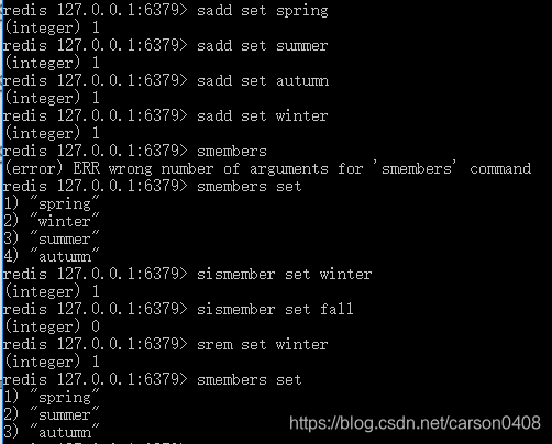 set使用无序方式存储元素,所以不能像列表那样,将元素推入集合的某一端,或者从集合的某一端弹出元素。不过set有自己的命令:sadd命令将元素添加到集合,srem命令从集合里面移除元素,sismember命令可以检查一个元素是否已经存在于集合中,smembers命令可以获取集合包含的所有元素(该命令执行速度在元素比较多的时候会比较慢)。sinter命令可以执行交集计算,sunion可以执行并集计算,sdiff可以执行差集计算。