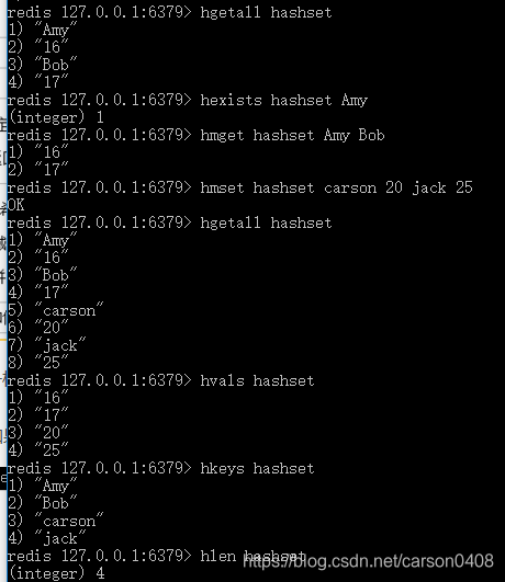 Redis的散列可以存储多个键值对之间的映射。和字符串一样,散列存储的值既可以是字符串又可以是数字值,并且可以对散列存储的数字值执行自增操作或者自减操作。常见的命令有:hset表示在散列里面关联起给定的键值对,hset表示获取指定散列键的值,hgetall表示获取散列包含的所有键值对,hdel表示如果存在散列表中,则移除这个键。具体使用示例如下: