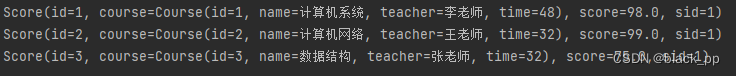@Data @Entity @Table(name = "student_score") public class Score { @Id @GeneratedValue(strategy = GenerationType.IDENTITY) @Column(name = "id") Integer id; @OneToOne//成绩表一对一到课程表 @JoinColumn(name = "cid") Course course; @Column(name = "score") Double score; //学生id,被用来对应的列 @Column(name = "sid") Integer sid; }然后在Student实体中,新增加一个List列表的属性(scores)表示关联属性表的多条数据;