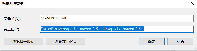 3. 新建环境变量MAVEN_HOME,赋值E:\tool\maven\apache-maven-3.6.1-bin\apache-maven-3.6.1