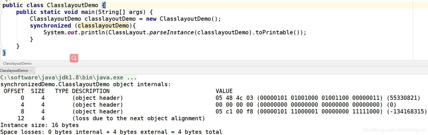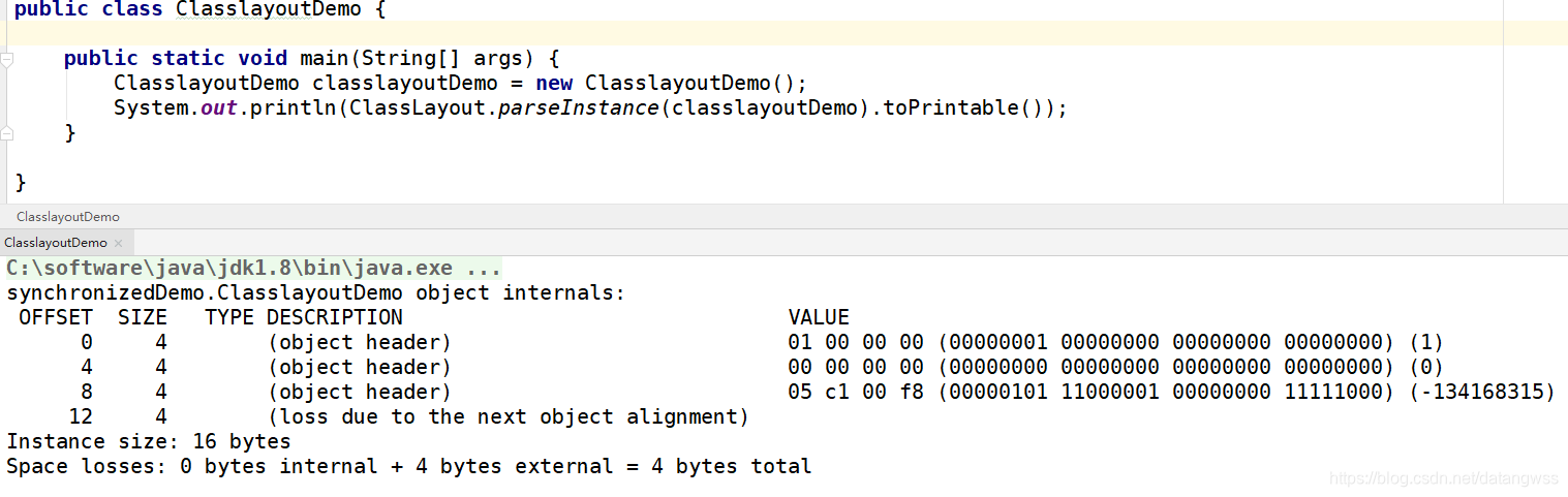 System.out.println(ClassLayout.parseInstance(classlayoutDemo).toPrintable());