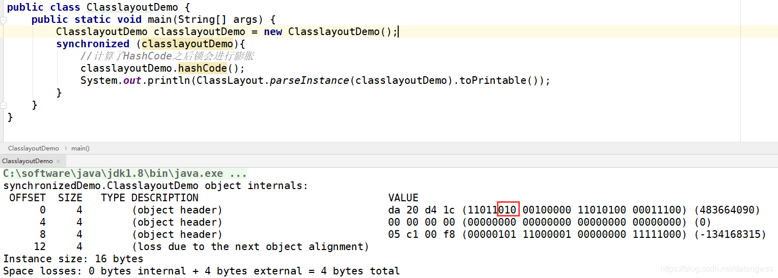 Space losses: 0 bytes internal + 4 bytes external = 4 bytes total00000000 00000000 00000000 00000000 00000011 00000100 11110111 10001000 可以看到为轻量级锁。