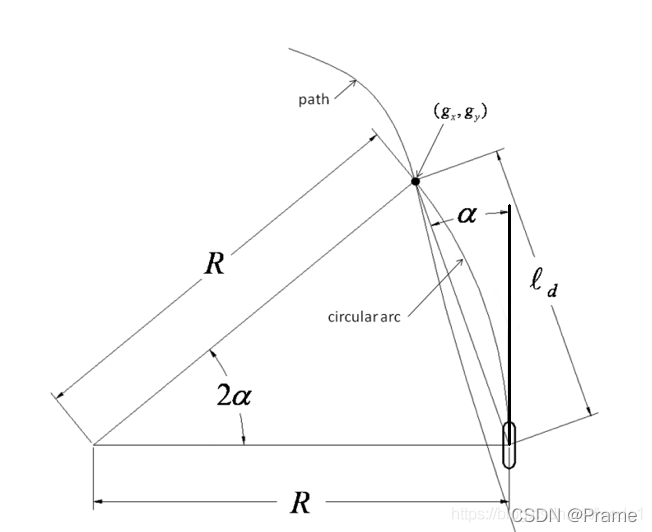 图中()是我们下一个要追踪的路点,它位于我们已经规划好的全局路径上,现在需要控制车辆是的车辆的后轴经过该路点,