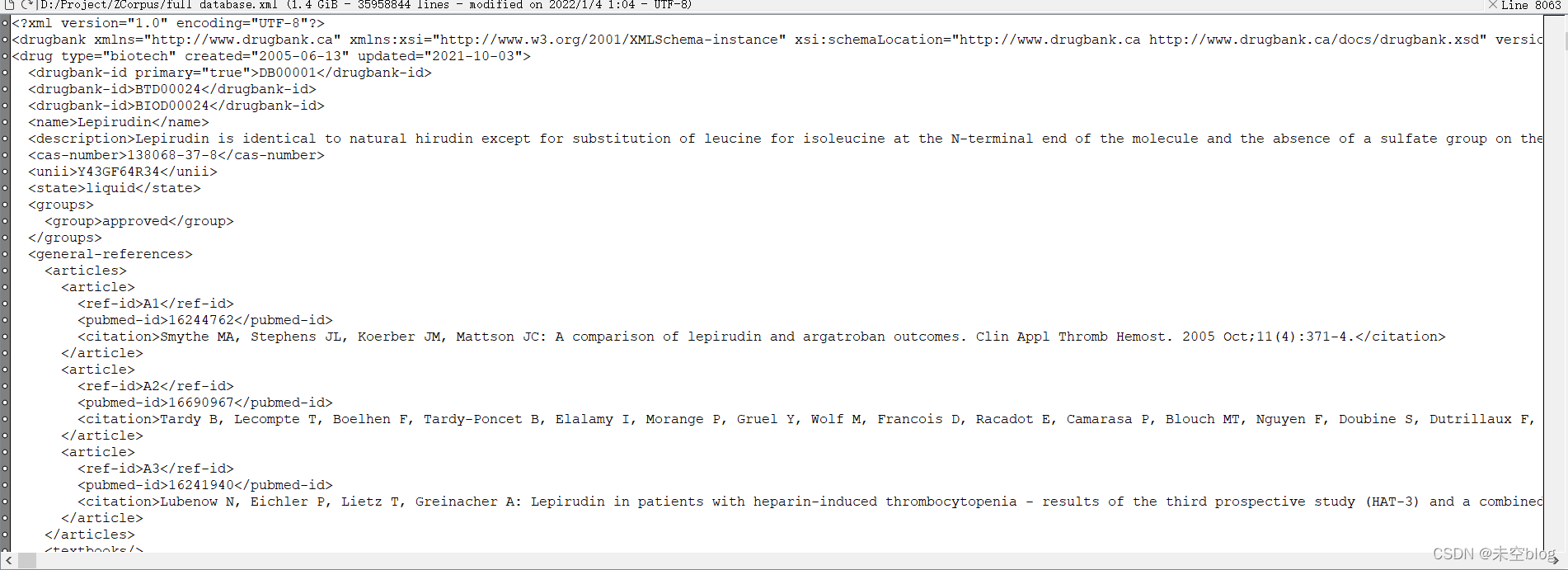 DrugBank是一个药物数据库,最近复现论文的时候总是用到这个数据库,但都是github上作者处理好的数据,我一直想看看drugbank长得啥样,就从官网上拿到了DrugBank数据集来看看