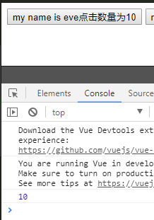 },template:'<button v-on:click="mycomponent_click">{{title}}点击数量为{{counter}}</button>'在父组件中,我们使用v-bind:的形式动态修改了title的值,将name变量的值赋给了title,并随后将该值传递至子组件中,在data中,我们设置了name的值为“my name is eve”。运行后可以看到,子组件的title值已经被我们修改为my name is eve。
