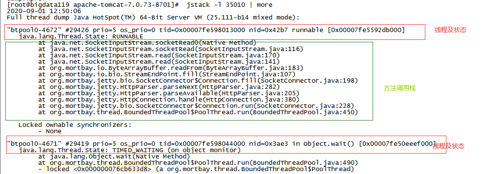 可以看到方法调用,方法的行号,就知道线程在执行什么方法。这个只能看到java的堆栈,一些本地堆栈看不到可以使用linux的pstack pid命令来继续深入查看。