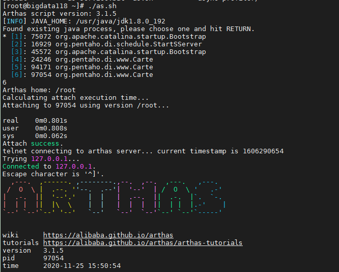 解压arthas-bin.zip后执行java -jar arthas-boot.jar或者as.sh进入arthas命令行界面
