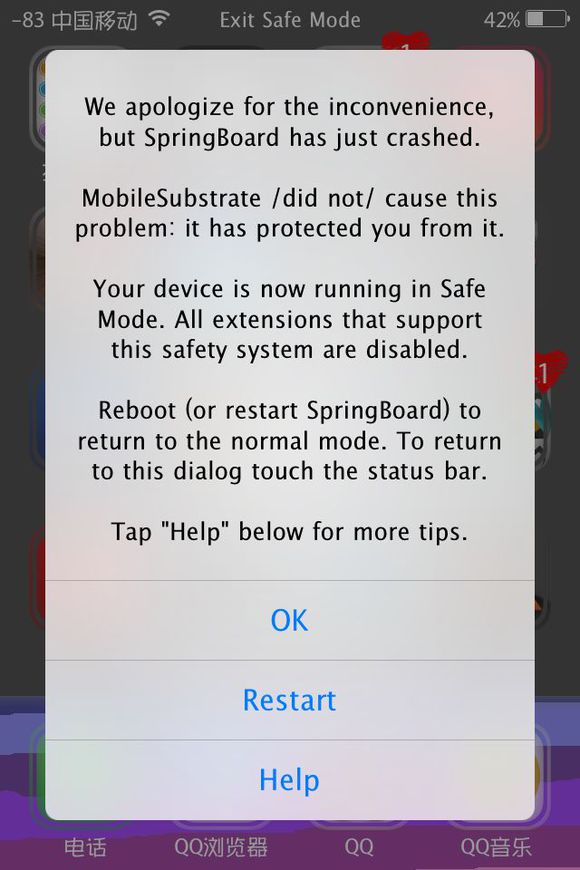 1、尝试直接点击弹窗中的“Restart”来重启springboard解决(如果您点击了弹窗的“ok”,想再次呼出safe mode提示窗,只需返回桌面点击一下状态栏即可)。如果该方法无效,您还是循环在safe mode模式,请继续往下看。