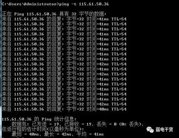这就说明电脑连接路由器是通的,网络效果很好。下面按按住键盘的Ctrl+C终止它继续ping下去,就会停止了,会总结出运行的数据包有多少,通断的有多少了。