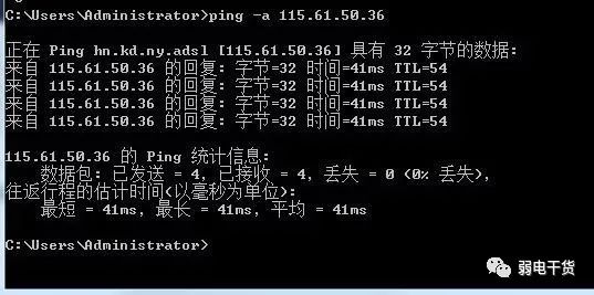 ping-a解析计算机名与NetBios名。就是可以通过ping它的ip地址,可以解析出主机名。当你遇到一个ip,却不知道他是那个设备时,这时你可以通过ping -a知道它的主机名。