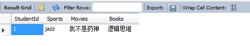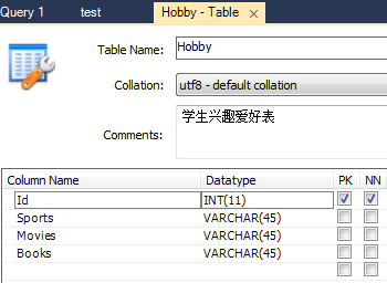 3.学生兴趣爱好表Hobby,表中包含字段Id(与上面信息关联Id关联),表中包含字段有Sports,Movies,Books