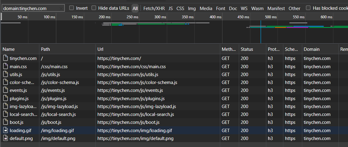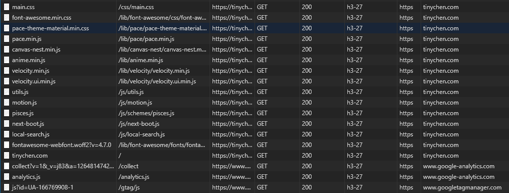0.0.0.0 | [24/Aug/2020:14:40:47 +0800] | 200 | tinychen.com | GET /js/utils.js HTTP/3 | https://tinychen.com/ | Mozilla/5.0 (Windows NT 10.0; Win64; x64; rv:79.0) Gecko/20100101 Firefox/79.0 | 0.000 | TLSv1.3 | TLS_AES_128_GCM_SHA256 | quic | h3-27