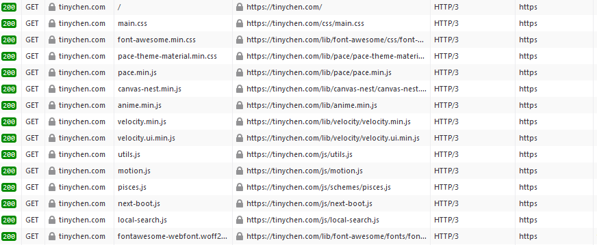 0.0.0.0 | [24/Aug/2020:14:40:47 +0800] | 200 | tinychen.com | GET /js/schemes/pisces.js HTTP/3 | https://tinychen.com/ | Mozilla/5.0 (Windows NT 10.0; Win64; x64; rv:79.0) Gecko/20100101 Firefox/79.0 | 0.000 | TLSv1.3 | TLS_AES_128_GCM_SHA256 | quic | h3-27