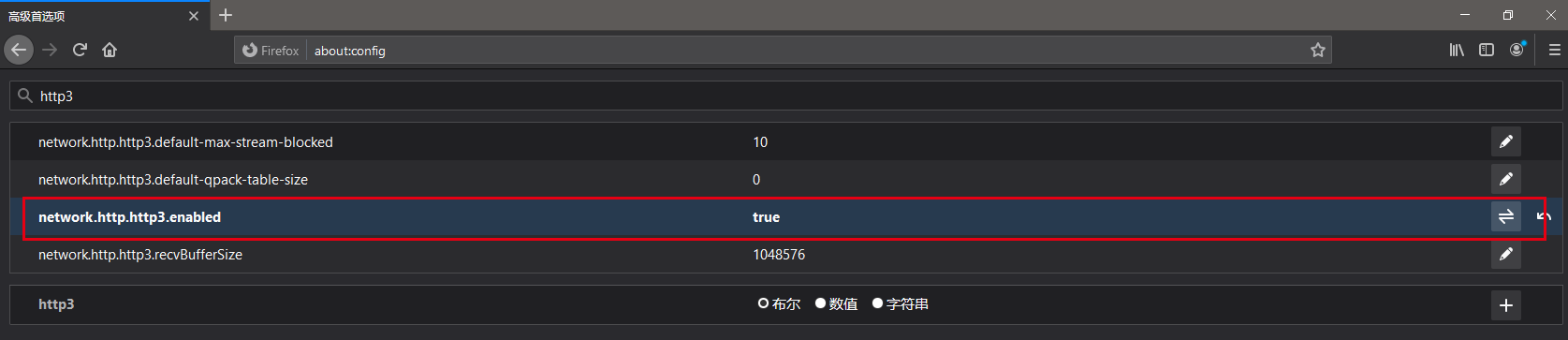 在firefox中开启http3比较简单,我们直接在地址栏中输入about:config,然后搜索http3,将network.http.http3.enabled设置为true,接着重启浏览器。