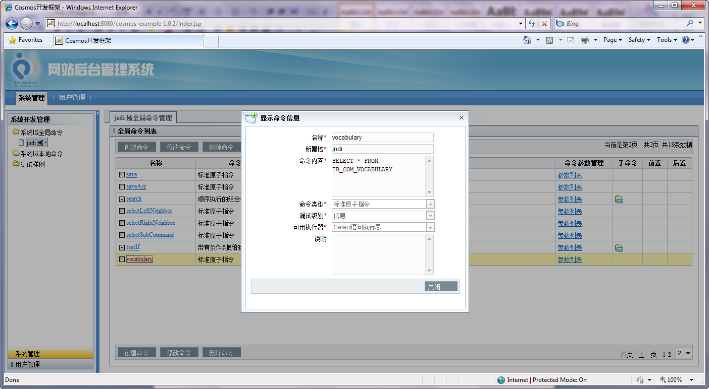 其中的几个参数分别代表的意思是:forward=test.vocabulary表示执行命令完成之后,跳转到test/vocabulary.jsp页面,domain=jndi表示要执行的命令是位于jndi域的,method=vocabulary表示要执行vocabulary命令。如果得到以下这样的界面,表示我们第一个样例程序已经开发完成了。