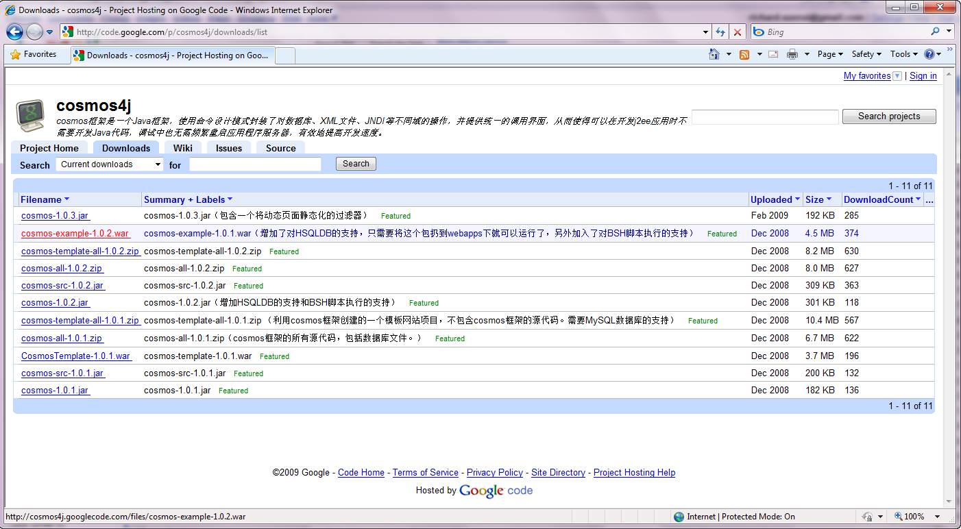 首先去Cosmos项目的网站下载最新版的Cosmos-Example程序,下载地址是:http://code.google.com/p/cosmos4j/downloads/list,在撰写本文时,Cosmos-Example发布的最新版是1.0.2,因此,下载最新版,如下图所示。