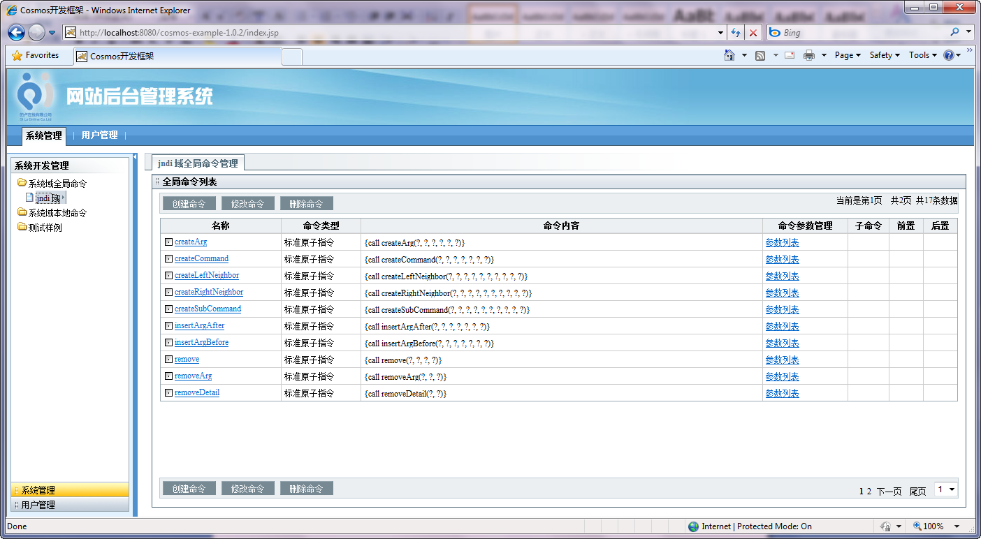 在打开的Cosmos网站界面中点击左侧菜单-系统域全局命令,在这个菜单下面可以看到当前Cosmos中配置的数据库域,目前仅配置了一个域,名称为jndi,点击这个域名,打开如下的界面: