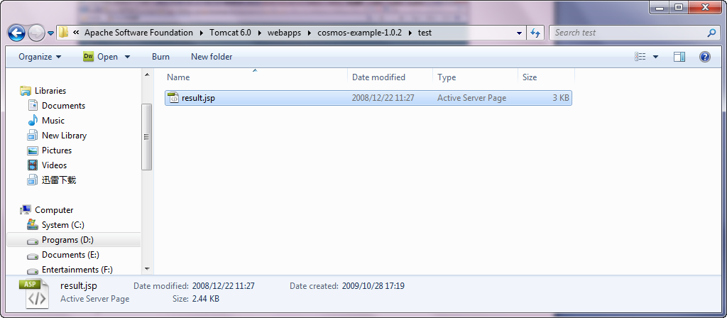 Cosmos-Example是一个打好的WAR包,因此,下载下来之后,只需要将这个war包放置到Tomcat的webapps下即可。如下图所示: