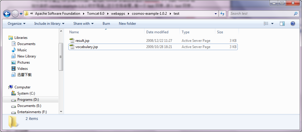 经过上面的这几个步骤,一条新的命令vocabulary就已经创建成功了,下面就可以开始为这条命令建立JSP的展示页面,首先到tomcat安装目录里的webapps下,找到Tomcat释放出来的cosmos-example-1.0.2的文件夹,这个文件夹里,有一个test目录,进入test目录,如下图所示: