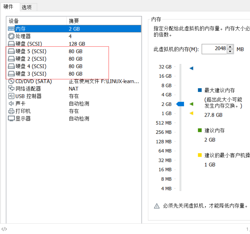 (2)往虚拟机里添加四块硬盘(具体步骤可以参考此博客第二段)