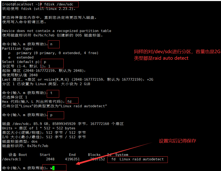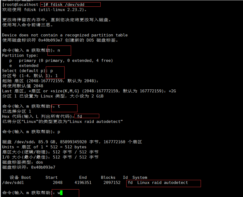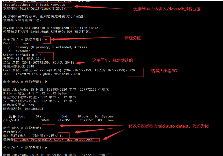 将其类型ID更改为“fd",对应为“Linux raidautodetect”,表示支持用于RAID磁盘阵列创建RAID设备