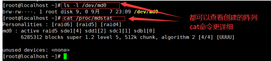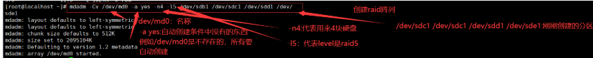 创建raid10 (先做镜象,再做条带) mdadm -Cv /dev/md0 -11 -n2 /dev/sd[bc]1 mdadm -Cv /dev/md1 -11 -n2 /dev/sd[de]1 mdadm -Cv /dev/md10 110 -n2 /dev/md0/dev/md1 创建raid5: madam -C -v /dev/md0 -l5 /dev/sd[bcd]1 -x1 /dev/sde1 madam:命令字 -C:创建 -v:显示过程 /dev/md0 : raid名字 -l5:级别 /dev/sd[bcd]1 : /dev/sdb1 /dev/sdc1 /dev/sdd1 指定使用这3块磁盘分区去创建RAID。 -x1:热备盘 ,x1表示保留1块空闲的硬盘作备用 /dev/sde1:热备盘的分区设备4.查看是否创建成功