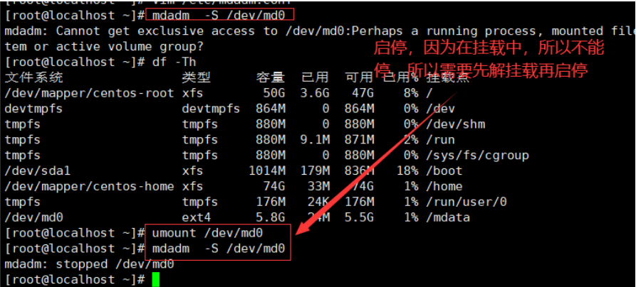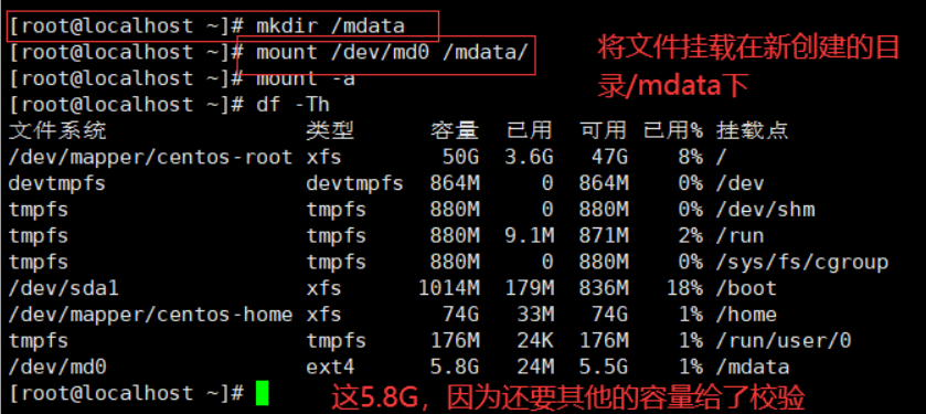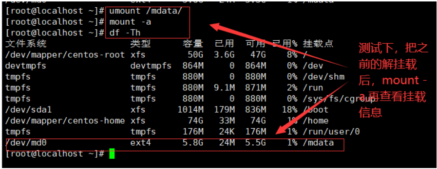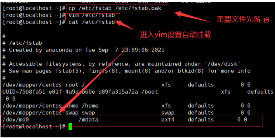 mkfs -t xfs /dev/imd0 建立文件系统 mkdir /myraid 创建挂载目录 mount /dev/md0 /myraid/ 挂载 df -Th 查看挂载信息 设置自动挂载 cp /etc/ fstab /etc/fstab.bak 备份 vim /etc/fstab 进入/etc/fstab编辑 /dev/md0 /myraid xfs defaults 0 06.实现故障恢复