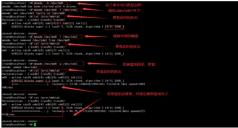 mdadm /dev/md0 -f /dev/sdc1 — 将指定磁盘设为故障 mdadm /dev/md0 -r /dev/sdc1 — 移除指定磁盘 mdadm /dev/md0 -a /dev/sdc1 — 添加指定磁盘