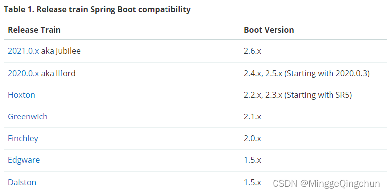 Spring Cloud发布的版本是一个按照字母顺序的伦敦地铁站的名字(“天使”是第一个版本,“布里克斯顿”是第二个),字母顺序是从A-Z,目前最新稳定版本 2021.0.x aka Jubilee,当Spring Cloud里面的某些子项目出现关键性bug或重大更新,则发布序列将推出名称以“.SRX”结尾的版本,其中“X”是一个数字,比如:Greenwich SR1、Greenwich SR2、Greenwich SR3