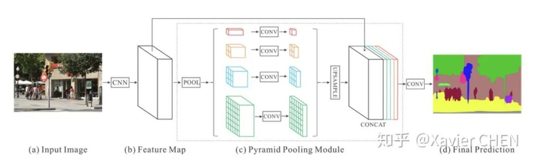 PSPnet则使用了空间金字塔池化,得到一组感受野大小不同的feature map,将这些感受野不同的map concat到一起,完成多层次的语义特征融合。