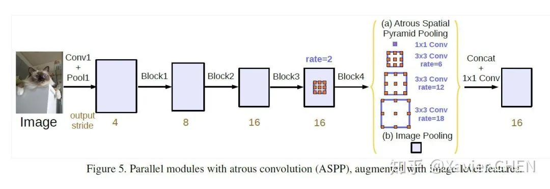 2.加入特征的全局平均池化(在扩张率很大的情况下,有效权重会变小)。如图14中的(b)Image Pooling就是全局平均池化,它的加入是对全局特征的强调、加强。