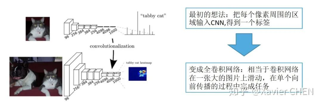 就像刚刚举的Alexnet的例子,对于任何的分类神经网络我们都可以用卷积层替换FC层,只是换了一种信息的分布式表示。如果我们直接把Heatmap上采样,就得到FCN-32s。如下图