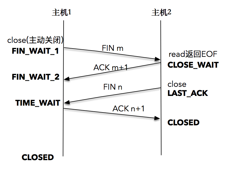 TCP 连接终止时,主机 1 先发送 FIN 报文,主机 2 进入 CLOSE_WAIT 状态,并发送一个 ACK 应答,同时,主机 2 通过 read 调用获得 EOF,并将此结果通知应用程
