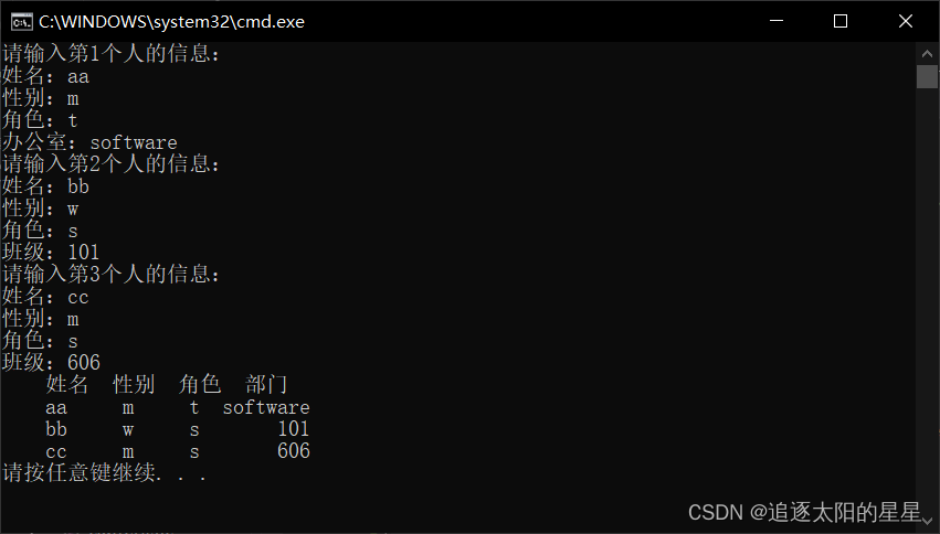 printf("%6s%6c%6c%10d\n", person[i].name, person[i].gender, person[i].role, person[i].dept.classname);