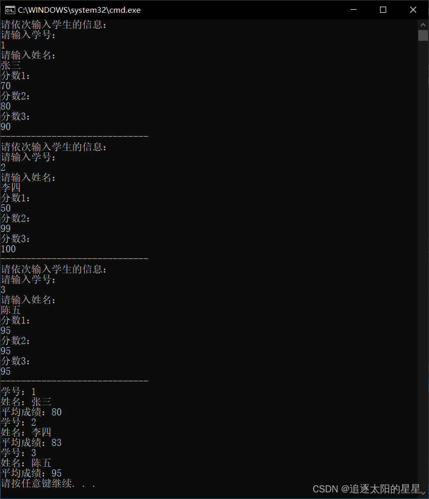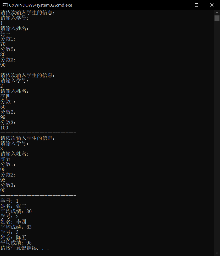 for ( k = 0; k < 3; k++) //输出三个学生的信息以及平均成绩