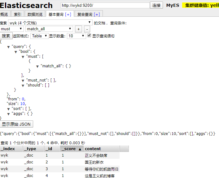 根据提示,我们访问http://wykd:9100 看看效果,已成功启动并访问我们的ES集群: