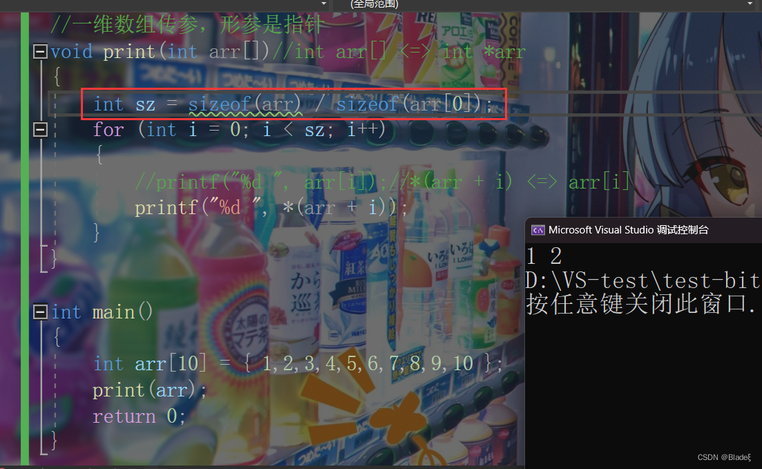 一维数组传参,形参是指针 void print(int arr[], int sz)//int arr[] <=> int *arr { for (int i = 0; i < sz; i++) { //printf("%d ", arr[i]);//*(arr + i) <=> arr[i] printf("%d ", *(arr + i)); } } int main() { int arr[10] = { 1,2,3,4,5,6,7,8,9,10 }; int sz = sizeof(arr) / sizeof(arr[0]); print(arr, sz); return 0; }能不能只传递一个参数呢?把数组的大小sz放到函数里面去计算