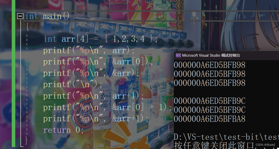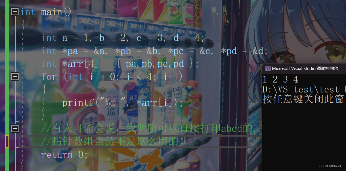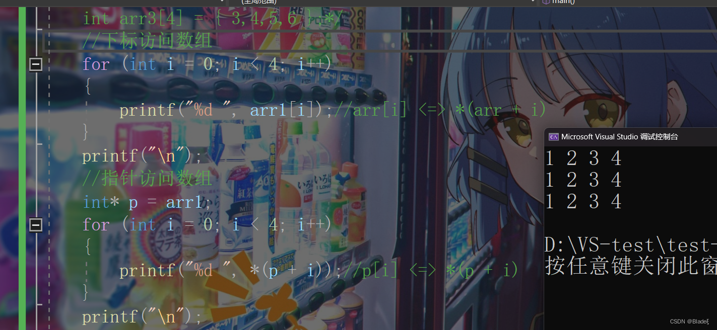 int arr[5]; int (*p)[5] = &arr; //演示代码 int main() { int arr1[4] = { 1,2,3,4 }; /*int arr2[4] = { 2,3,4,5 }; int arr3[4] = { 3,4,5,6 };*/ //下标访问数组 for (int i = 0; i < 4; i++) { printf("%d ", arr1[i]);//arr[i] <=> *(arr + i) } printf("\n"); //指针访问数组 int* p = arr1; for (int i = 0; i < 4; i++) { printf("%d ", *(p + i));//p[i] <=> *(p + i) } printf("\n"); //数组指针访问数组 int(*pa)[4] = &arr1; //p -- &arr //*p -- *&arr //*p -- arr for (int i = 0; i < 4; i++) { ///把(*pa)[i] 写成 *pa[i] 这样的形式 //编译器可能跑的过去,但这样是存在问题的 printf("%d ", (*pa)[i]); //*(*pa + i) <=> (*pa)[i] } printf("\n"); return 0; } 运行结果如下: