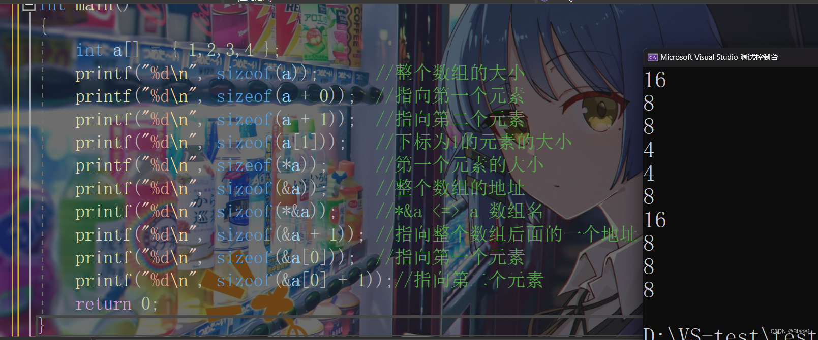 数组 -- 能够存放一组相同类型的元素,数组的大小取决于它的元素个数和元素类型 指针 -- 泛指地址,也可以是指针变量,大小是4/8个字节 数组名(arr) -- 通常情况下表示数组首元素的地址,但是有两个特殊情况表示整个数组 1)sizeof(arr) ,计算的是整个数组的大小 2)&arr ,取出的是整个数组的地址 注意:arr、&arr[0]、&arr 数值上相同,但是表示的意义不同 分析下面代码的运行结果 int main() { int a[] = { 1,2,3,4 }; printf("%d\n", sizeof(a)); printf("%d\n", sizeof(a + 0)); printf("%d\n", sizeof(a + 1)); printf("%d\n", sizeof(a[1])); printf("%d\n", sizeof(*a)); printf("%d\n", sizeof(&a)); printf("%d\n", sizeof(*&a)); printf("%d\n", sizeof(&a + 1)); printf("%d\n", sizeof(&a[0])); printf("%d\n", sizeof(&a[0] + 1)); return 0; }