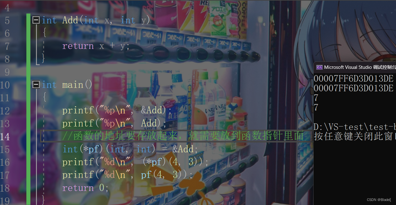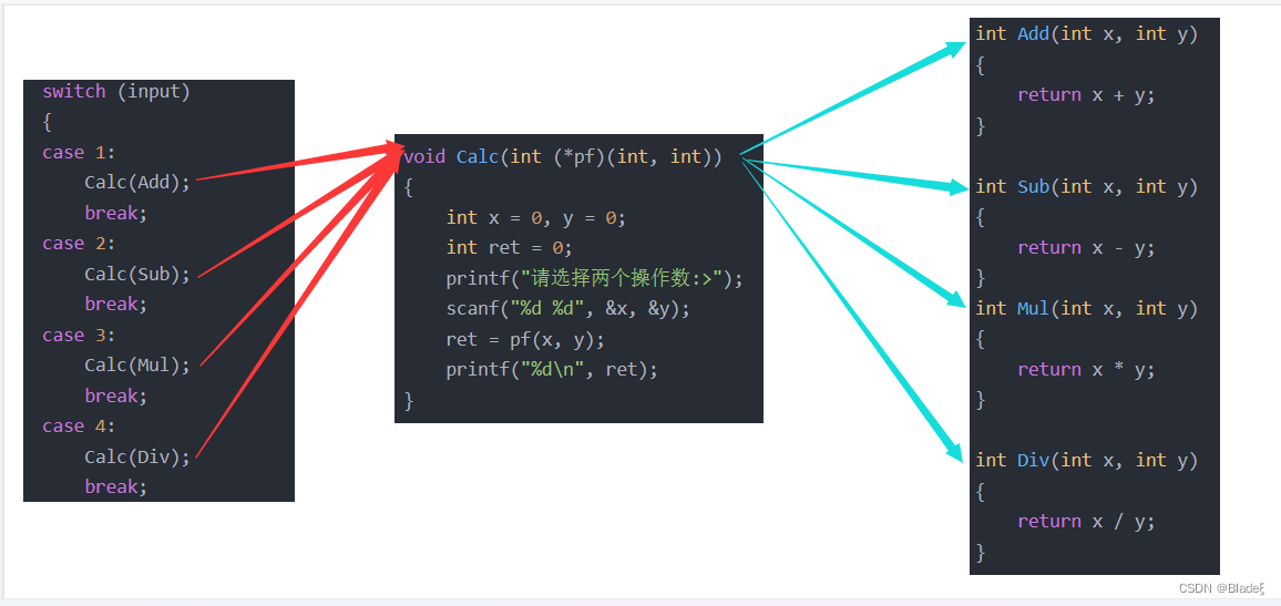 int Add(int x, int y) { return x + y; } int Sub(int x, int y) { return x - y; } int main() { int (*pf)(int, int) = Add; //函数指针数组 int (*pfArr[4])(int, int) = { Add, Sub }; //指向函数指针数组的指针 int (*(*ppfArr)[4])(int, int) = &pfArr; return 0; }
