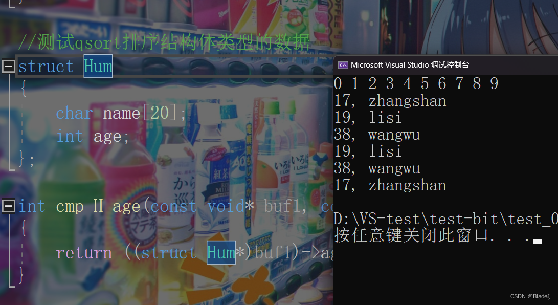 qsort是一个库函数,可以排序任意类型的数据,头文件是 <stdlib.h> 这里我们不关心qsort是如何实现排序的,只需要学会如何使用就够了 //void qsort(void* base,//指向待排序数组的第一个元素 // size_t num, //待排序的元素个数 // size_t size, //每个元素的大小(字节) // //指向一个函数,这个函数可以比较两个数据的大小 // int (*compare)(const void*, const void*) //); //注意: void* 类型的指针不能进行解引用操作,也不能进行加一减一操作 //void* -- 无具体类型的指针,可以接收任何类型的地址 #include <stdio.h> #include <stdlib.h> #include <string.h> //qsort使用者需要自己实现该函数 int cmp_int(const void* buf1, const void* buf2) { return *(int*)buf1 - *(int*)buf2; } //测试qsort排序整型数组 void test1() { int arr[10] = { 9,8,7,6,5,4,3,2,1,0 }; int sz = sizeof(arr) / sizeof(arr[0]); //用qsort排序一个整型数组,我们需要创建一个函数,能够比较两个整型的大小 qsort(arr, sz, sizeof(arr[0]), cmp_int); for (int i = 0; i < sz; i++) { printf("%d ", arr[i]); } printf("\n"); } //测试qsort排序结构体类型的数据 struct Hum { char name[20]; int age; }; int cmp_H_age(const void* buf1, const void* buf2) { return ((struct Hum*)buf1)->age - ((struct Hum*)buf2)->age; } int cmp_H_name(const void* buf1, const void* buf2) { return strcmp(((struct Hum*)buf1)->name, ((struct Hum*)buf2)->name); } void print_H(struct Hum* h, int sz) { for (int i = 0; i < sz; i++) { printf("%d, %s\n", (h + i)->age, (h+i)->name); } } void test2() { struct Hum h[] = { {"zhangshan", 17},{"lisi", 19},{"wangwu", 38} }; int sz = sizeof(h) / sizeof(h[0]); qsort(h, sz, sizeof(h[0]), cmp_H_age); print_H(h, sz); qsort(h, sz, sizeof(h[0]), cmp_H_name); print_H(h, sz); } int main() { test1(); test2(); return 0; }运行截图