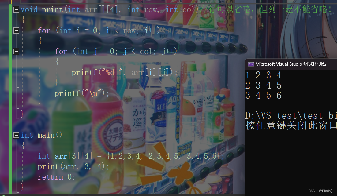 二维数组的数组名 -- 表示首元素地址 int arr[3][4] = {1,2,3,4, 2,3,4,5, 3,4,5,6}; 我们也可以这样理解: 二维数组其实可以看成是一维数组的数组 arr[0] = {1, 2, 3, 4}; arr[1] = {2, 3, 4, 5}; arr[2] = {3, 4, 5, 6}; arr[3][4] = {arr[0], arr[1], arr[2]}; //打印输出时可以做如下替换 arr[i][j] <=> *(*(arr + i) + j) //函数调用创建形参可以做如下替换 int arr[3][4] <=> int (*arr)[4]3.数组传参分析