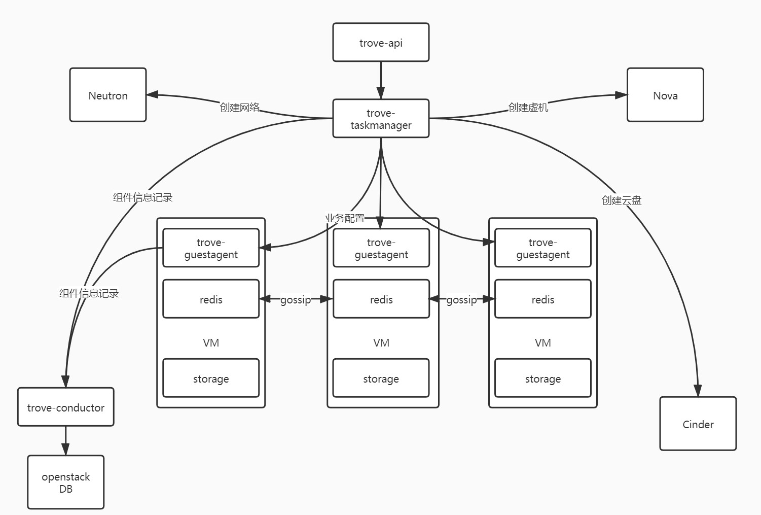下面是一个Trove管控一个redis集群的实例。trove-api是trove中对外提供接口的部分,接收到请求后调用trove-taskmanager的程序。trove-taskmanager通过调用下层的Nova、Neutron、Cinder等服务提供的API,创建出三个虚机(Nova),虚机中不仅有redis服务,还有一个负责存储的硬盘(Cinder),并且虚机之间网络打通可以互相通信(Neutron)。创建完毕后,trove-taskmanager通过对每个trove-guestagent发送实际业务配置,trove-guestagent将整个redis集群建立起来。期间产生的各种信息记录,通过trove-conductor落到openstack自身的数据库保存。