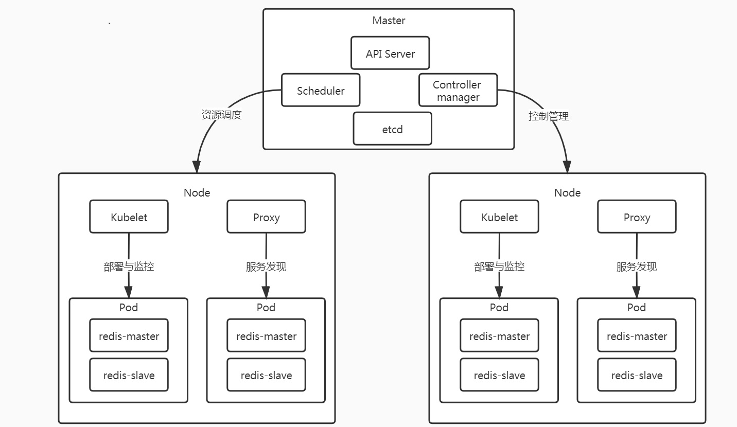 如下图所示,k8s分为master和node两种角色,redis运行其中接受管理。具体master和node中各个进程如何交互管理就不在此展开了。
