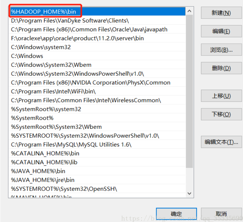 path添加%HADOOP_HOME%\bin(win10不用分号或者如下编辑界面不用分号,其余加上 ;)