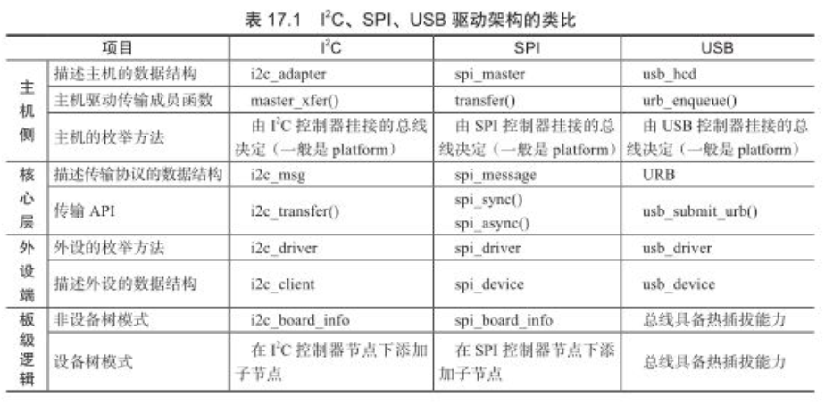 这里借助一张图来对比linux下,i2c、spi、usb三个子系统的相似之处。